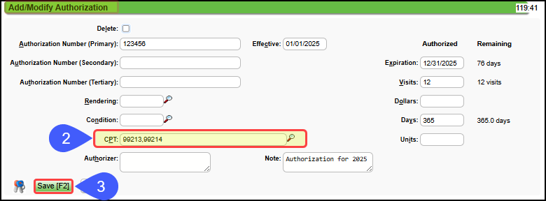 A limitation can be set on the Authorization for specific CPT ® codes.