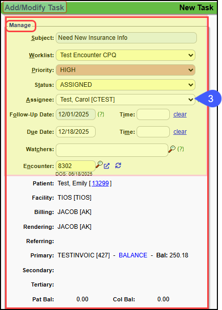 Complete the Manage Panel on the Add/Modify Worklist Task pop-up window.