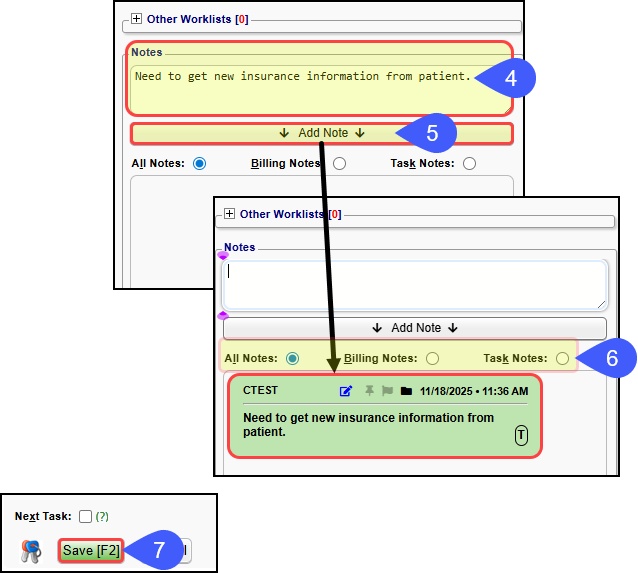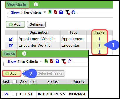 On the Worklist screen, select the number link in the Tasks column from the Worklist where you want to add a Task.