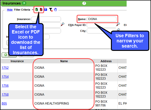 Use the Filter Criteria to find an Insurance/Payer or a Type of Insurance.