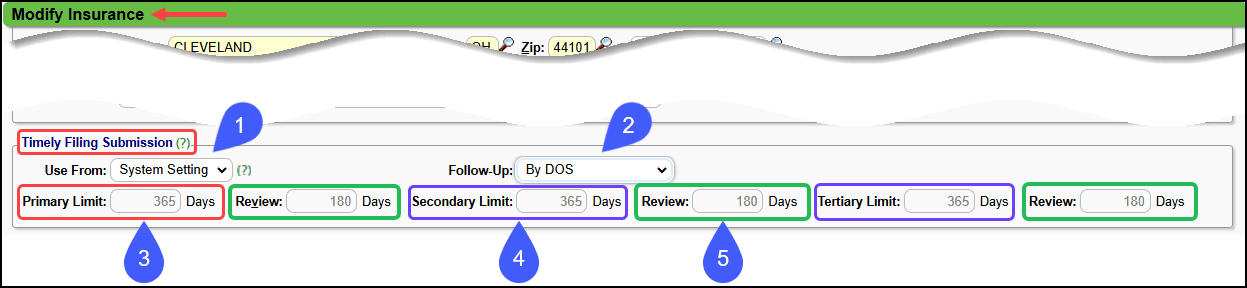 Capture Timely Filing days for Payers to track, manage, and report to prevent delays or denials. The Limit fields are Day values, such as 45 days, 180 days, 365 days, etc. By default this is calculated from Billed Date.