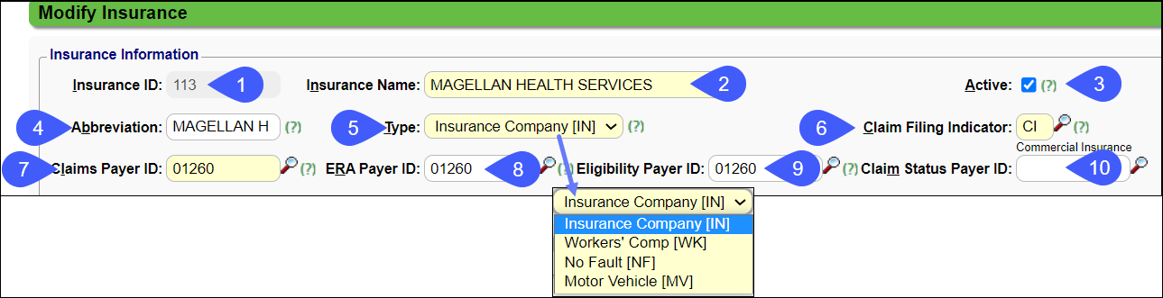 - From the Type dropdown list, select Insurance Company unless it is for Worker's Comp, Collection Agency, or other.