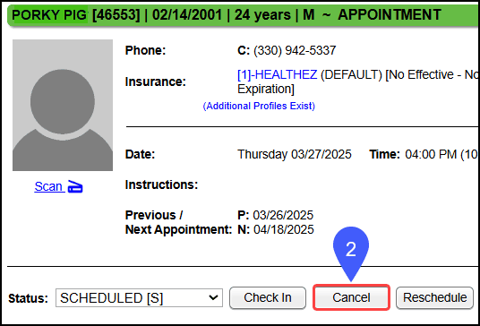 - Select the Cancel button on the Patient Appointment screen.