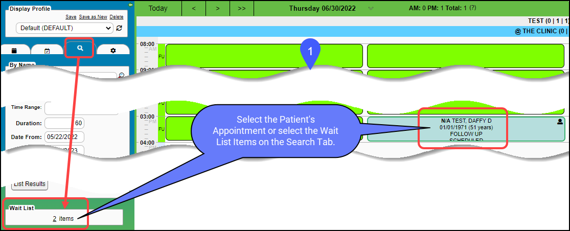 - Select the Patient's Existing Appointment. (The Patient can also be chosen from the Wait List on the Search Tab.)
