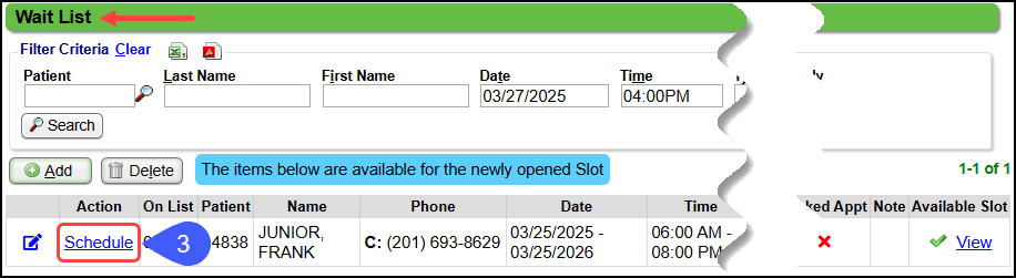 - On the Wait List pop-up, select a Patient to schedule in the canceled slot.
