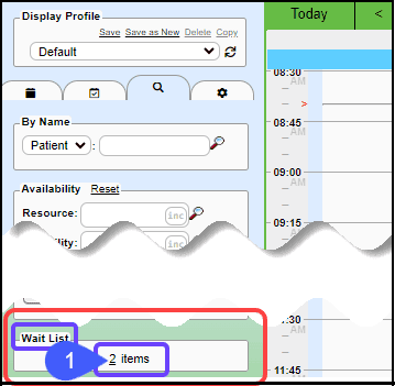 - On the Search Tab on the Calendar view, open the Wait List by selecting the Items number in the Waitlist panel.