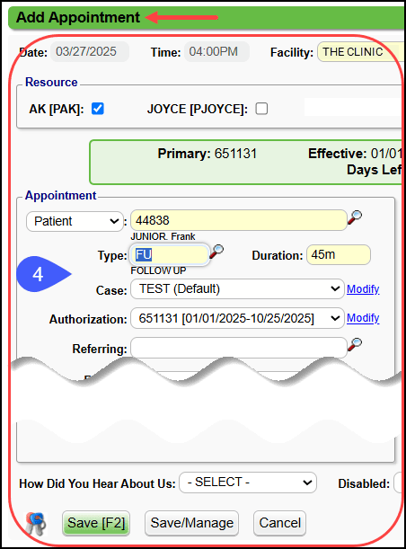 - After completing the Add Appointment screen, select Save [F2].