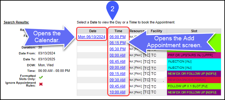 - Select the Date link to view the calendar for that day to make the appointment from the Calendar