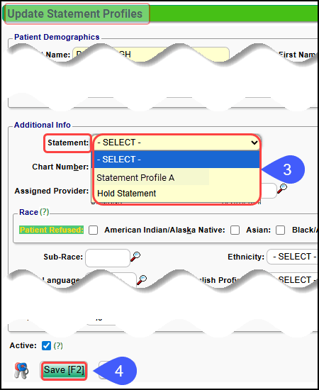 - In the Additional Info panel on the Modify Patient screen, select the Statement Profile from the Statement dropdown.