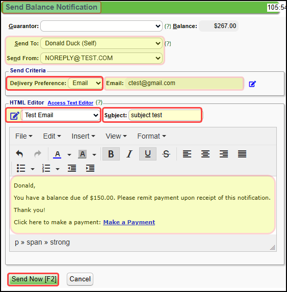 Instead of using Send Balance Notification on the Patient Dashboard, you can create an On-Demand Statement.