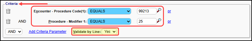When Validate by Line is set to Yes, the selected Criteria must exist together on the same Procedure Line.
