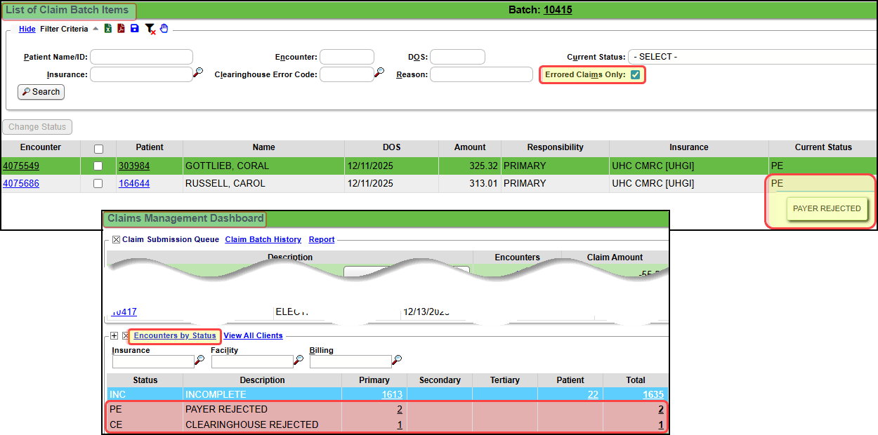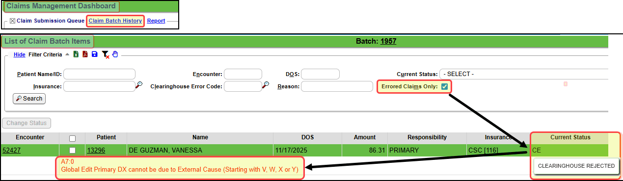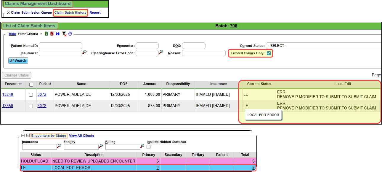 This error means all claims have local edit errors so the entire batch is not sent. To view the errors from the Claims Batch Dashboard, select Claims Batch Items. Select the Errored Claims Only checkbox, or go back to the Encounters by Status panel.