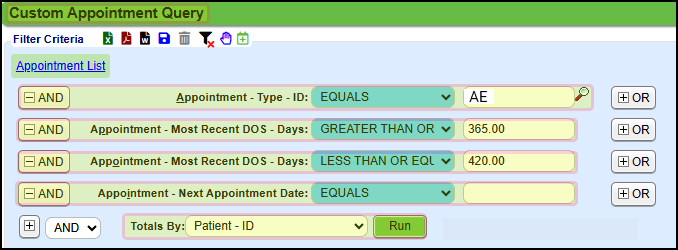 - Appointment - Most Recent DOS - Days: Greater Than or Equal To 365.00