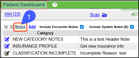 In the Notes Panel on the Patient Dashboard, select the Notes link.