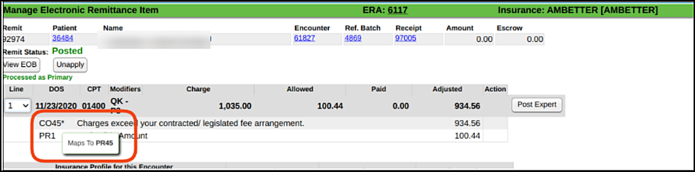 For example, when a payer sends PR45 on a Remit that you want to have posted as CO45, the Crosswalk can change this automatically. The Mapping displays on the Remit when you hover over the CARC Code.