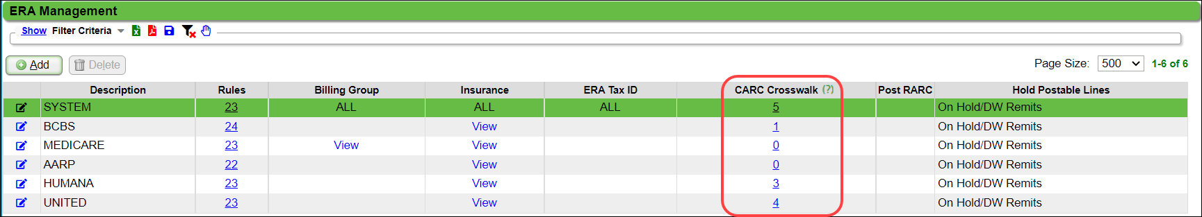 If the Crosswalk only applies to specific Insurances, make sure those Insurances are specified in the Insurance column of the ERA Management Profile. Hover over View to see a list of Insurances attached. If the Insurance is not listed, add it or create a new Profile to add the Insurance.