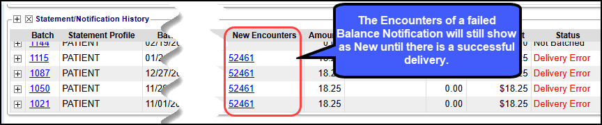 - The Encounters of a failed Balance Notification will still show as new in the next Statement Batch until a successful delivery. Therefore, they will not be considered Previously Billed since a Notification was not received by the Guarantor.