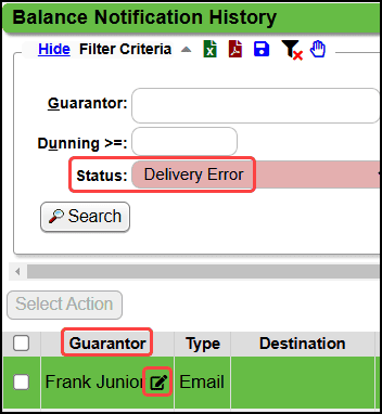 - Use the Modify icon in the Guarantor column to update the email address.