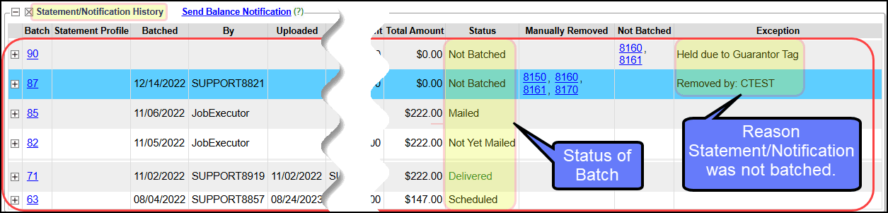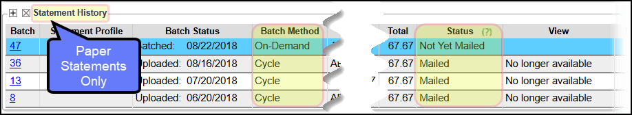 - Status: The status of the Statement/Notification, such as Not Batched, Not Yet Mailed, etc.