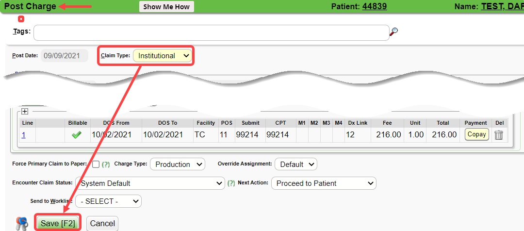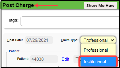 On the Post Charge screen > Claim Type> choose Institutional (If you do not see the Institutional Option, ask your administrator to do the setup.)