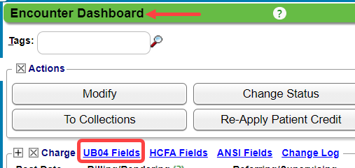 - Page 2: Use the UB04 Fields link on the Encounter Dashboard.