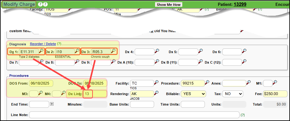 In the DX Link field at the bottom of the Modify Charge Line screen, enter the Diagnosis numbers to link to that particular CPT.