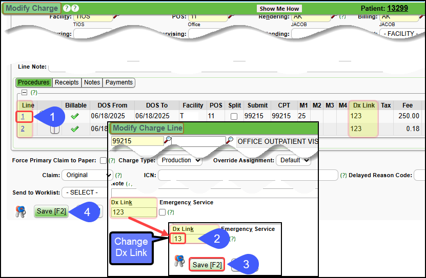 On the Modify Charge screen, click the line item number of the CPT to link the Diagnosis Codes.