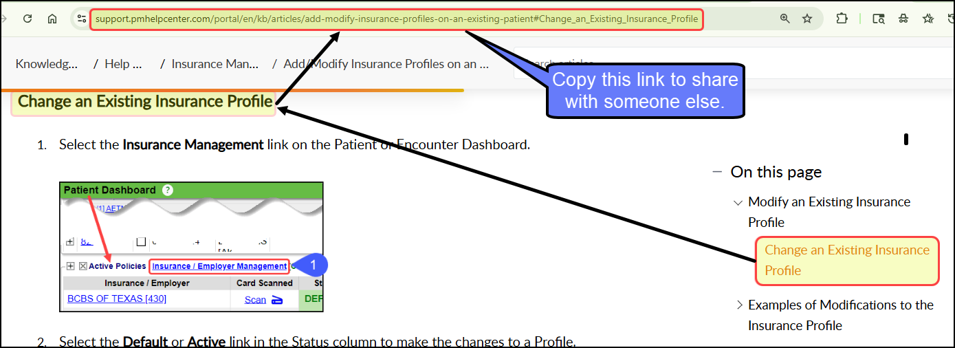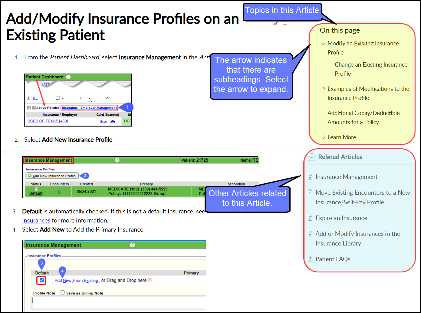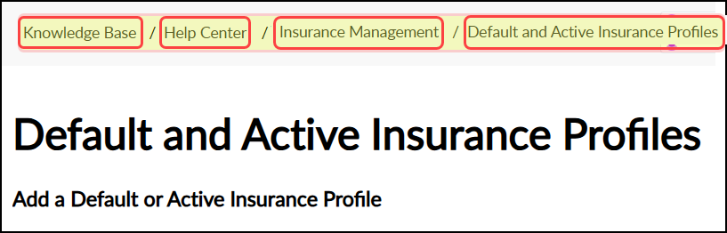 Example: Knowledge Base / Help Center / Insurance Management / Default and Active Insurance Profiles.