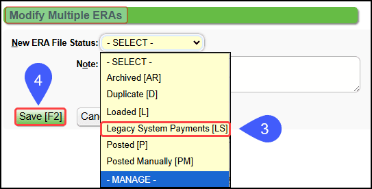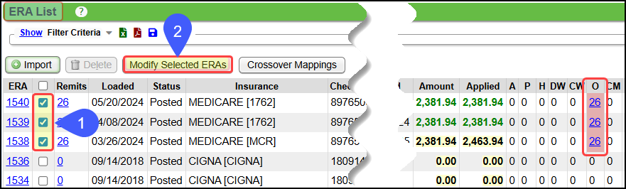- These Legacy Payments will be listed in the O column on the ERA List screen.