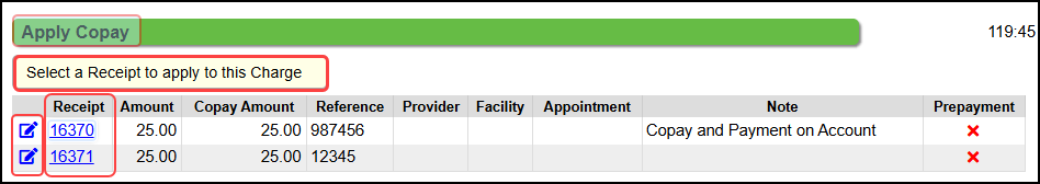 In the Copay Pop-up during Charge Entry, select the Receipt number to attach to the appropriate Encounter.