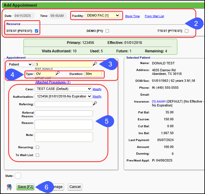 - The Date, Time, Facility, and Resource default from the Appointment Slot selected on the Calendar.