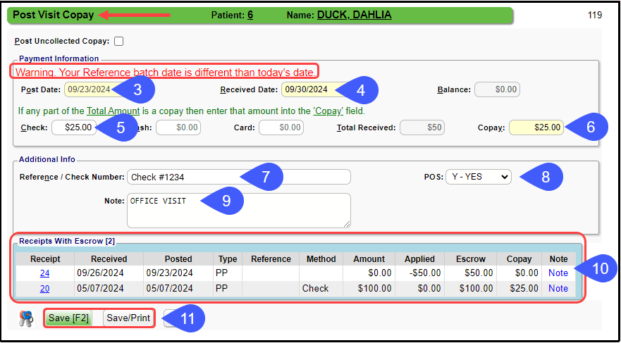 - Select Save [F2] to save the Post Visit Copay screen, or select Save/Print to save the screen and print a Receipt.