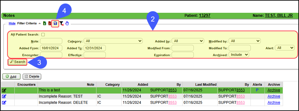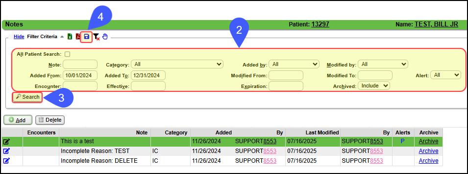 Patient Notes can also be printed using the Custom Patient Query Report for a specific Patient for specific dates.