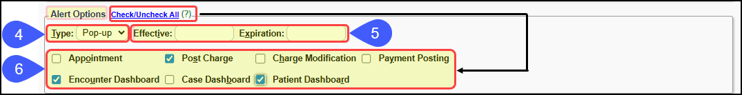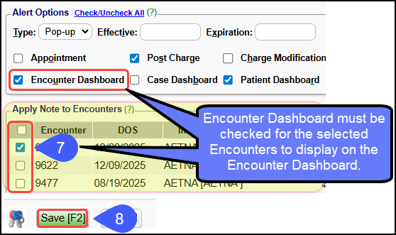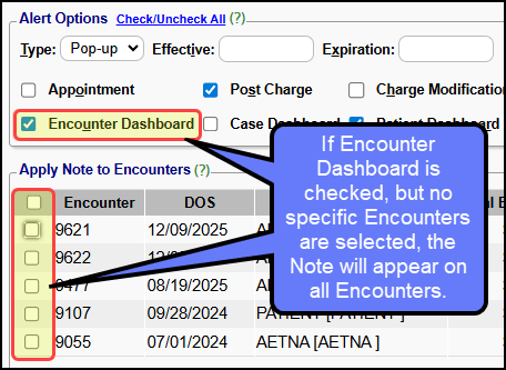 If the Encounters checkbox is selected in the Alert Options panel, but specific Encounters are not selected in the Apply Note to Encounters panel, the Note will display on all Encounters.