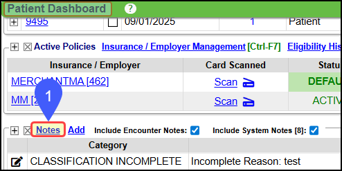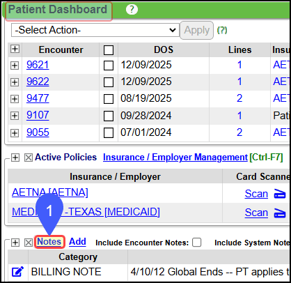 From the Patient Dashboard Notes panel: