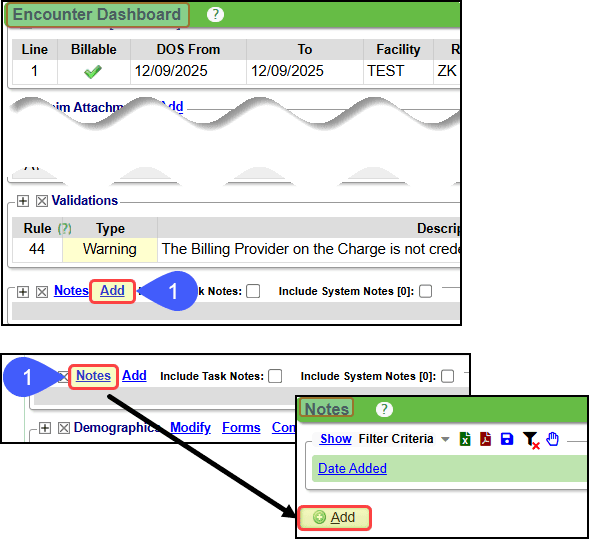 Users can manually add Notes on the Patient and Encounter Dashboards.