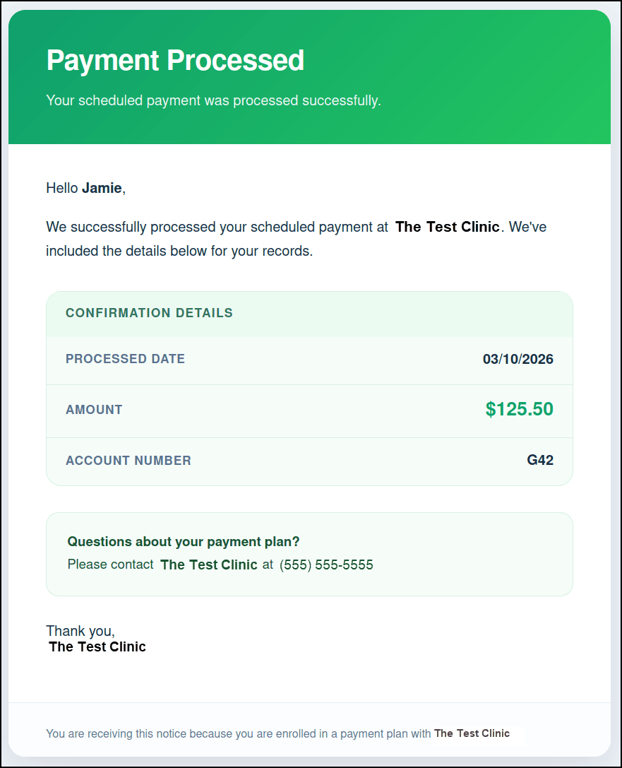 - Payment Processed: Notifies the Guarantor that the Payment was processed successfully and that no further action is needed.