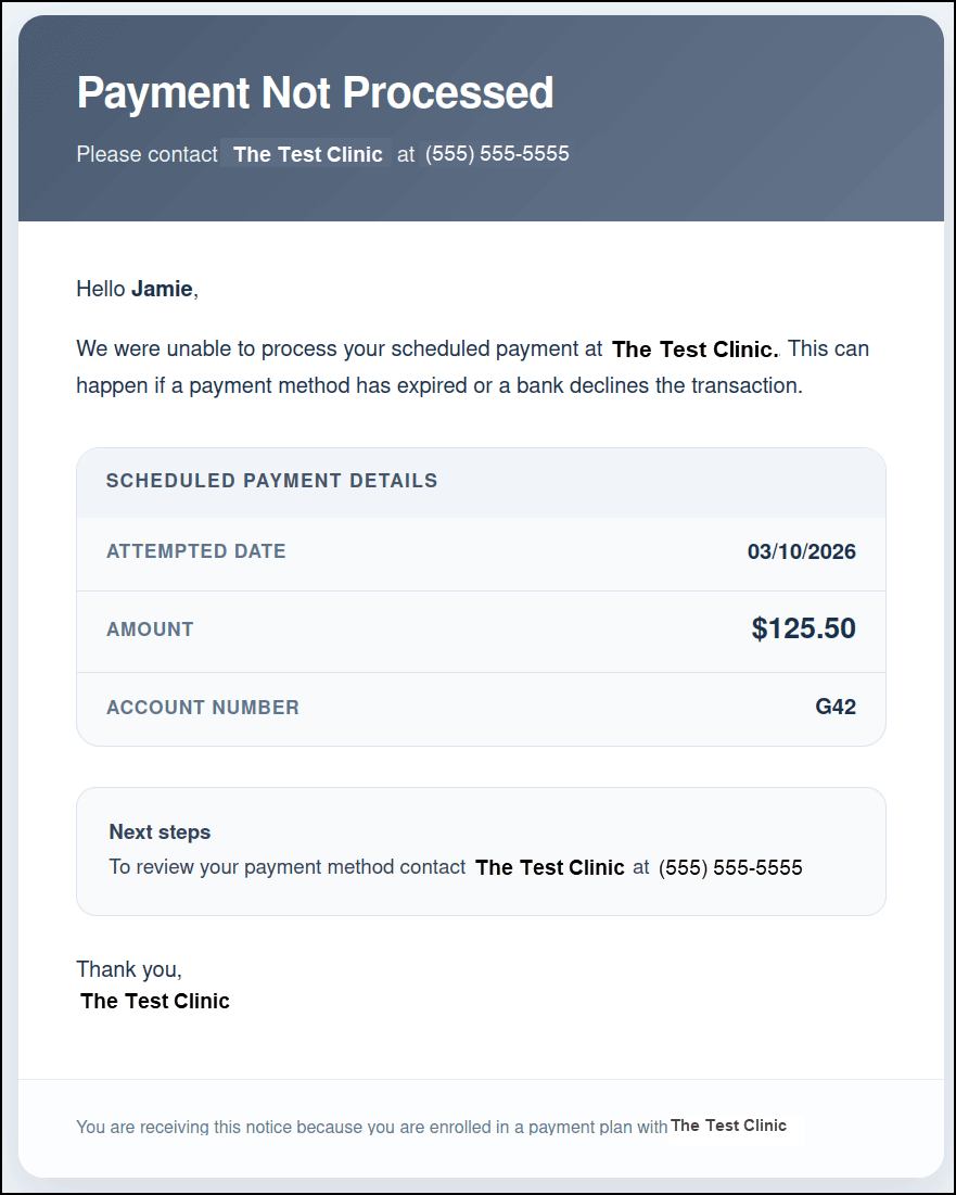- Payment Not Processed: Notifies the Guarantor that the Payment was not processed successfully. The Guarantor should contact the office for more information.