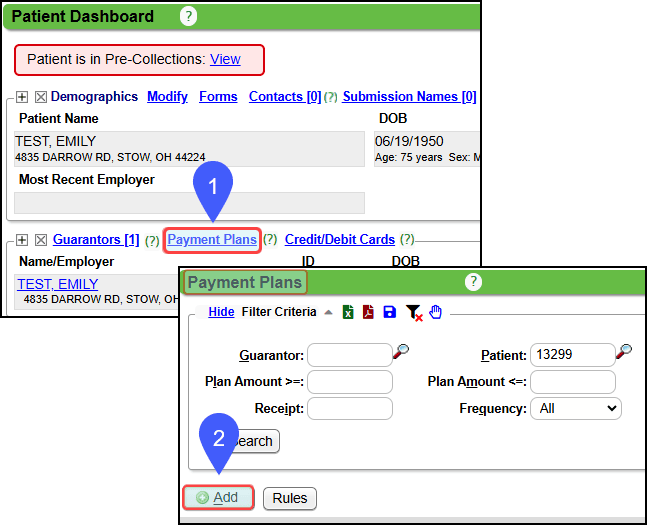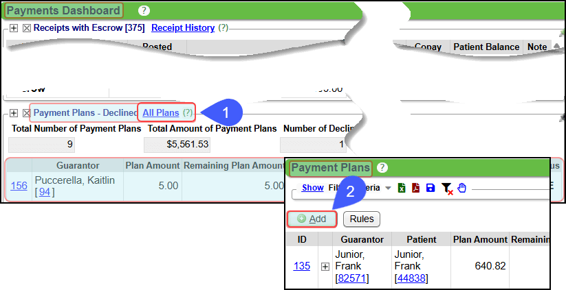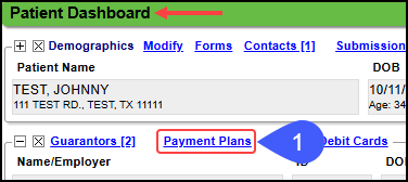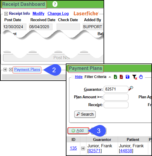 Payment Plans can be added from the Patient Dashboard, Payments Dashboard, Receipt Dashboard, or Guarantor Dashboard.