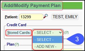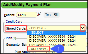 - On the Add/Modify Payment Plans screen, select Add New from the Stored Cards dropdown.