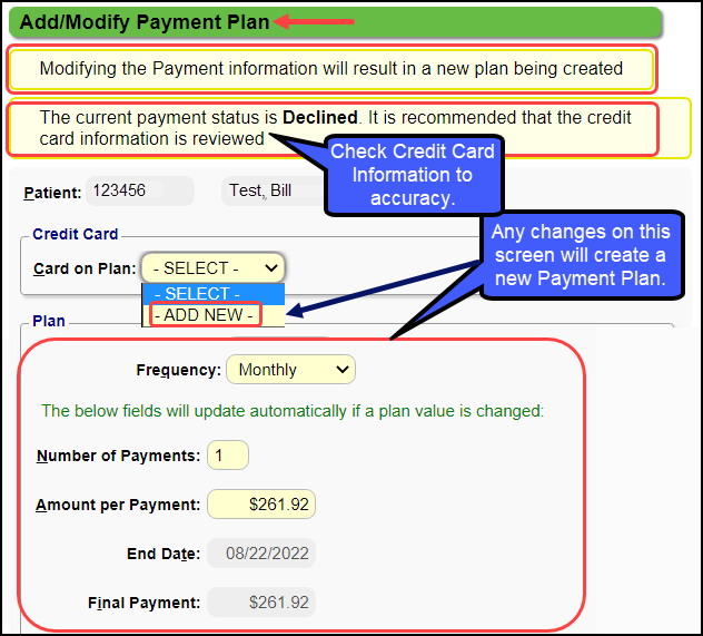 A Credit/Debit Card can be added from the Patient Dashboard or from the Stored Card dropdown on the Add/Modify Payment Plans.