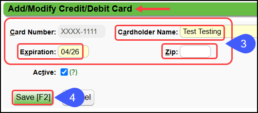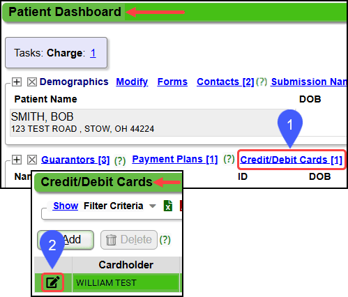 The modifications can be made from the Credit/Debit Cards link on the Patient Dashboard.