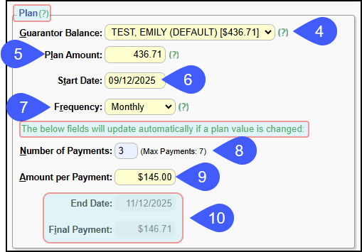 - Plan Amount: Auto-populates from the Guarantor's Balance, but can be changed manually.