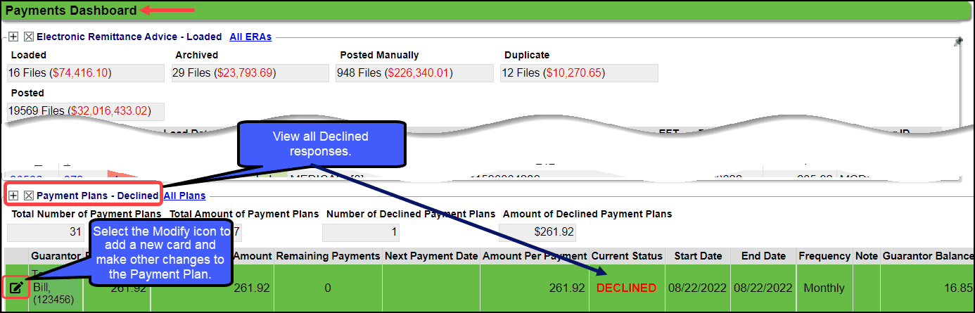 Declined: This workable section shows all Payment Plans that have a current status of Declined.