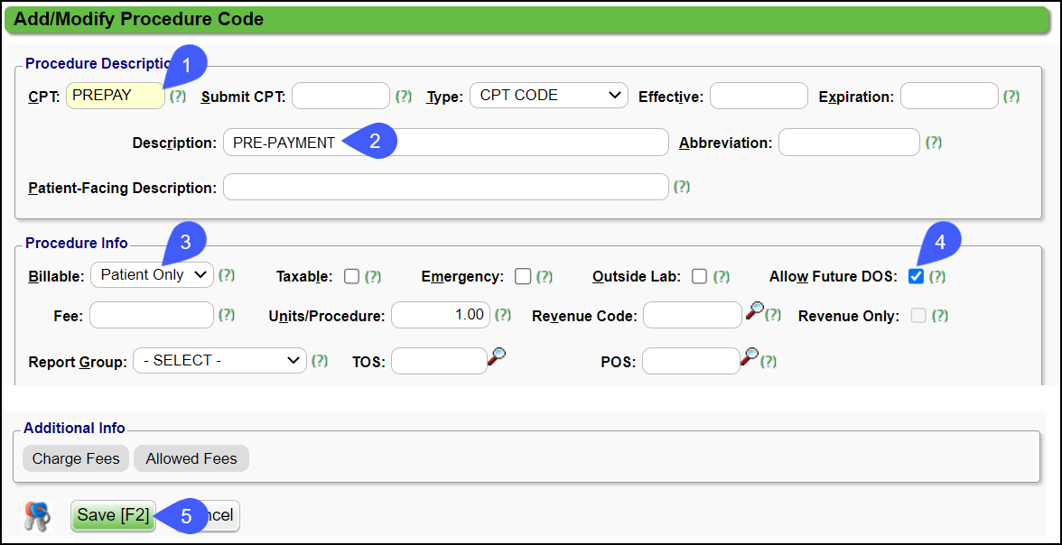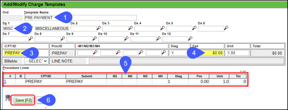 - Press Tab until the new Charge Template appears under Procedure Lines. If you do not tab through the fields, the Charge template will Save but the Procedure Line will not Save.