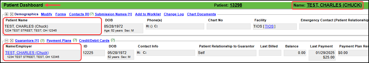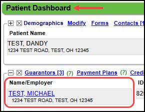 - On the Patient Dashboard, select Guarantor's Name.