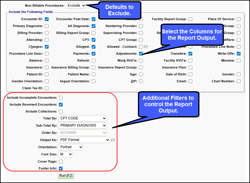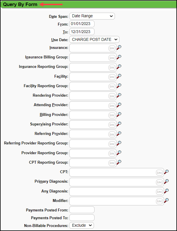 - Charge Post date or Service date?: This report always runs Charges with associated payments and adjustments no matter which date type is chosen.