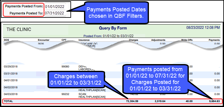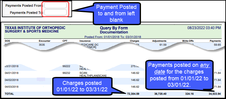 - Other Financial reports show Charges posted in the Post Date range and Payments posted in the same range which might not be related to the reported Charges at all.