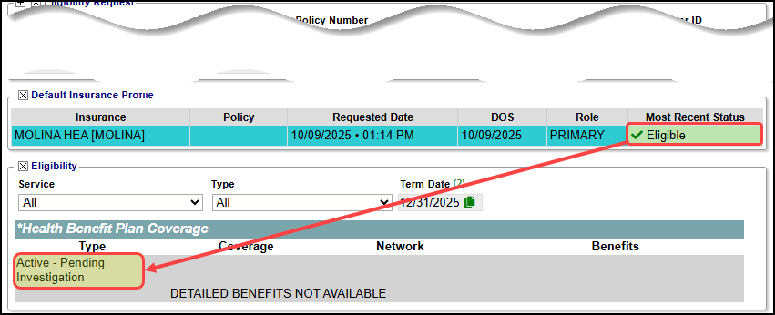 The Patient has a Medicare Advantage (Replacement/Part C) plan, but the Claim was sent to Medicare. A Message will be in the body of the Eligibility Report with the Name of the Insurance.