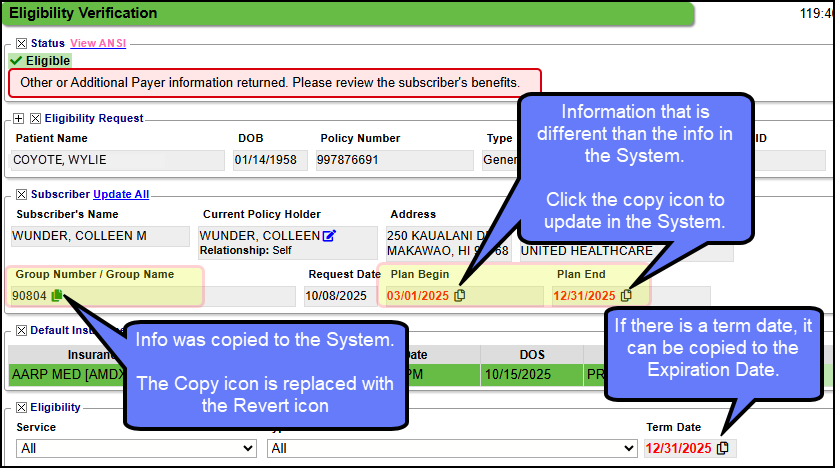 Other or Additional Insurance Plans may also be found with responses, Eligible with Exceptions.